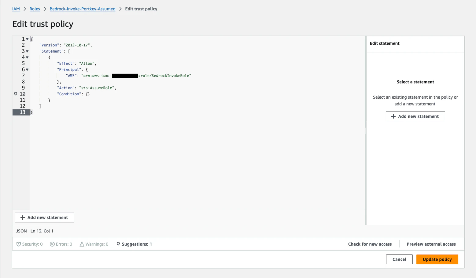 Once the role is created, open the role and navigate to the Trust relationships tab and click Edit trust policy. This is where you will add the Portkey AWS account as a trusted entity.Portkey Account ARN