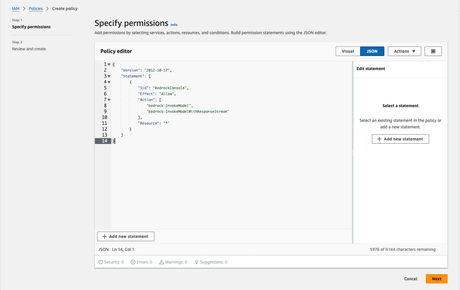 This role you create will be used by Porktey to execute InvokeModel commands on Bedrock models in your AWS account. The setup process will establish a minimal-permission (βleast privilegeβ) role and set it up to allow Porktey to assume this role.Create a permission policy in your AWS account using the following JSON